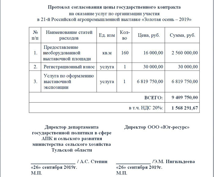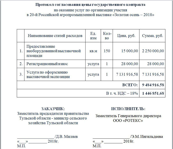 Вероятно, соседи решили, что найдут исполнителей, которые окажут подобные услуги дешевле. А может они строго придерживаются Закона, ведь решение тульского министерства сельского хозяйства не проводить конкурсные процедуры, а выбрать закупку у единственного поставщика выглядит довольно сомнительным с правовой точки зрения. К тому же в госконтракте нет даже подобия сметы на оформление выставочной композиции за 6,8 млн рублей, что тоже должно бы настораживать.