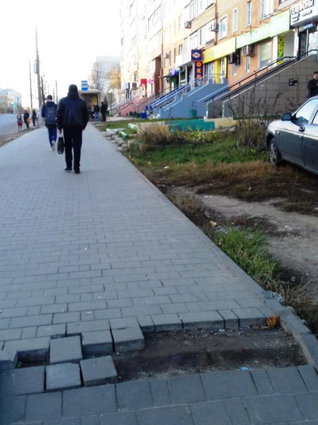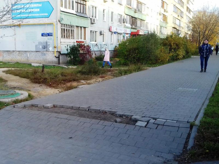 Плитка начала разрушаться больше года назад: сначала откололось несколько «кирпичиков», сейчас разрушено покрытие вдоль всей ширины дорожки рядом с домами №125 по улице Ложевая и №25 по улице Кирова. Людям с колясками и на инвалидных колясках это доставляет огромное неудобство и создаёт опасность для жизни.