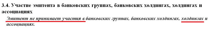 Эмитент не участвует в банковских группах, банковских холдингах, холдингах и ассоциациях (п.3.4 отчета за 1-й квартал 2019 г).