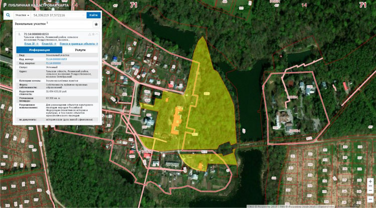 Вот тут на фотке то, что желтое — это музейная земля. Усадьба обмеряна и стоит на учёте. К прудам, которые копали холопы нашего гиганта мысли, выхода у музея видимо уже нет.