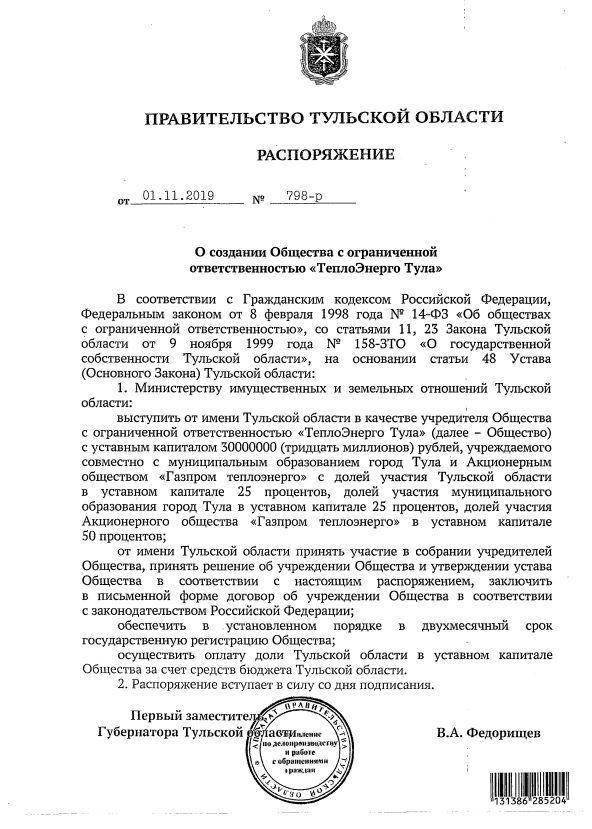 Распоряжением правительства Тульской области министерству имущественных и земельных отношений региона поручено выступить учредителем Общества с ограниченной ответственностью «ТеплоЭнерго Тула» с уставным капиталом 30 миллионов рублей, учреждаемого совместно с муниципальным образованием город Тула и акционерным обществом «Газпром теплоэнерго» с долей участия области в уставном капитале 25%, города — 25%, «Газпром теплоэнерго» — 50%.
