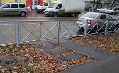 То машину замуровывали, а теперь придуман новый пешеходный переход (фотография от 04.11.19 г.), перекресток ул. Руднева с ул. Станиславского . Для легкоатлета, а точнее, для бегуна с барьерами. Можно и коляской перепрыгивать, выполнен специальный спуск.