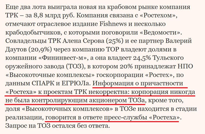 В последнее время «эффективные менеджеры» Ростеха, контролирующие тульские оборонные предприятия, своим размахом и всеядностью удивляют не только туляков, но и всю Россию: производство алкоголя, сельское хозяйство, а теперь еще и квоты на вылов краба почти за 9 млрд рублей. И хотя «перспективные инвестиции» в прожекты, очень далекие от машиностроения, производятся не напрямую оборонными предприятиями, очевидно, что используются деньги, заработанные тульской оборонкой.
