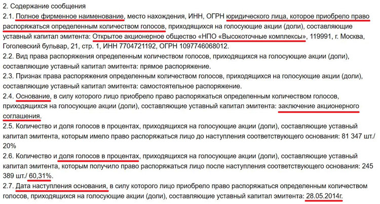 Например, сообщение о существенном факте «О приобретении лицом права распоряжаться определенным количеством голосов, приходящихся на голосующие акции (доли), составляющие уставный капитал эмитента»: