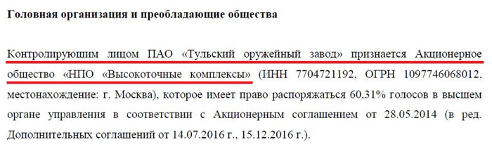 Можно посмотреть другие документы ПАО «Тульский оружейный завод», например, бухгалтерскую отчетность, которую на акционерном собрании ТОЗа утвердили акционеры, в т.ч. и  АО «НПО «Высокоточные комплексы»: