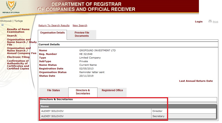 GROFOUND INVESTMENT LTD готовится к ликвидации, так как свою роль по выводу денег за пределы нашей Родины, она уже выполнила. В том числе, и по расщеплению финансовых потоков, которые, как я предполагаю, контролировал уже бывший председатель правительства Тульской области Юрий Михайлович Андрианов.