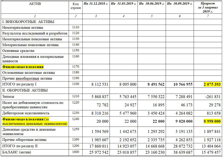 Как видно из таблицы, за 3-й квартал более чем на 2 млрд  рублей выросли внеоборотные активы и на 9 млрд рублей выросли краткосрочные финансовые вложения. Скорее всего, рост внеоборотных активов вызван ростом долгосрочных финансовых вложений, но не будем гадать.
