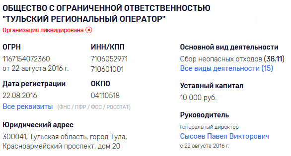 В сентябре этого года было ликвидировано ООО, с весьма занятным наименованием – «Тульский региональный оператор».