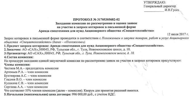 А теперь другой документ, протокол рассмотрения заявки уже знакомого нам ООО «Благоустройство города»
