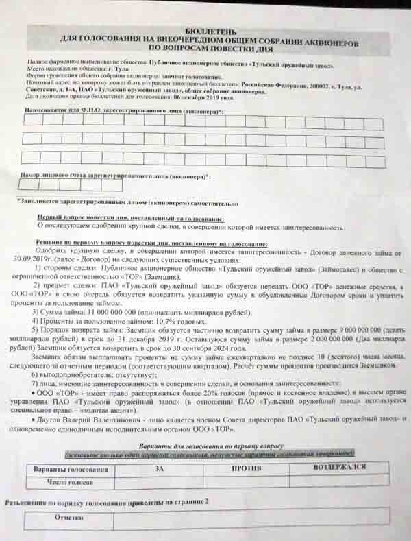 Акционеры Публичного акционерного общества «Тульский оружейный завод» получили по почте бюллетень для заочного голосования на внеочередном собрании по одному единственному вопросу, а именно: одобрить крупную сделку по передаче Тульским оружейным заводом (заимодавец) обществу с ограниченной ответственностью «ТОР» (заемщик) 11000000000 (одиннадцать миллиардов) рублей под 10,7 процентов годовых.