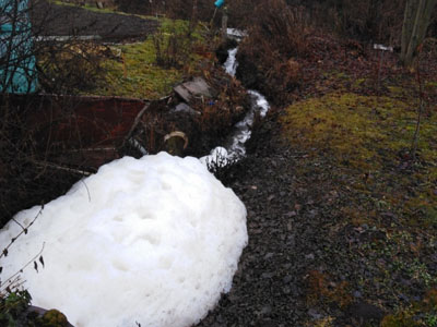СНТ «Энергетик», «Агрохимия», «Мостовик» и несколько других расположены на берегах речки Иншинки. Думается, надо очень любить отеческие грядки (дачи тут издревле), чтобы дышать миазмами, которые распространяет напитавшаяся ручьями Иншинка. Один «приток», впадающий в неё, берёт свое начало в трубе, выглядывающей из-под забора очистных сооружений ООО «Рассвет». По ручью плывут хлопья вонючей пены, образующей в устье величественные сугробы (на фото). Вокруг – дачная идиллия: домики, яблоньки, беседки… Сейчас прохладно, но, тем не менее, атмосфера навевает мысли о противогазе. Как и чем владельцы дач дышат, когда летняя жара, лучше не думать.
