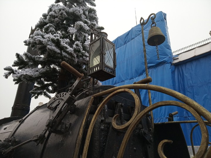На улице Металлистов в Туле установлен макет паровоза Черепановых. Он сделан в сервисном корпоративном бюро железной дороги в Узловой и приехал в Тулу в рамках конкурса корпоративных елок.