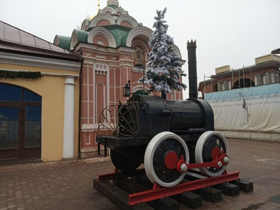 На улице Металлистов в Туле установлен макет паровоза Черепановых. Он сделан в сервисном корпоративном бюро железной дороги в Узловой и приехал в Тулу в рамках конкурса корпоративных елок.