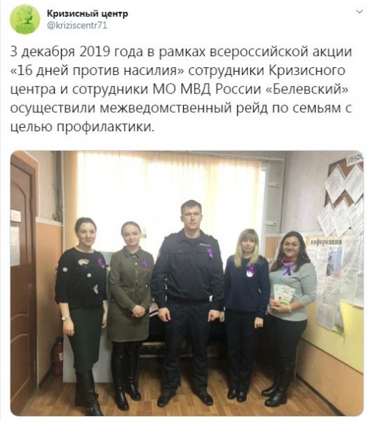 В Тульской области эта акция проходит с широким размахом, с использованием всемирной символики символа борьбы с насилием – фиолетовой ленточки, совершенно случайно аналогичного символу феминизма. В акции участвуют все муниципалитеты, образовательные учреждения, полиция.