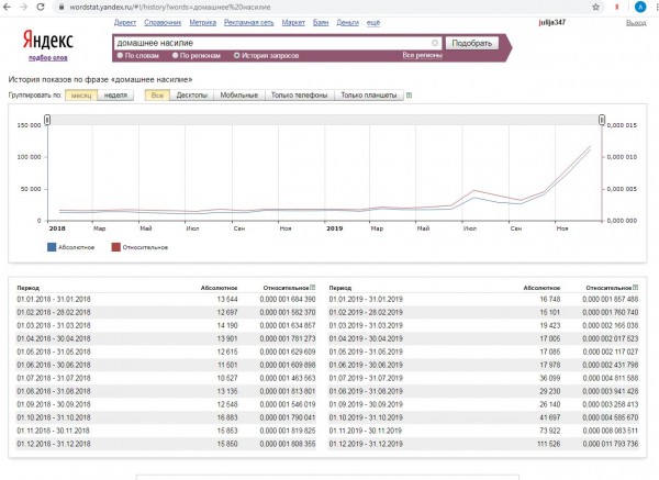 До начала раскрутки тема мало кого интересовала. Об искусственно раздуваемом интересе к проблеме домашнего насилия говорит запрос по ключевым словам в программе вордстат: