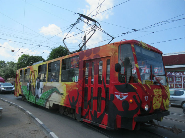 Трамвайный вагон, разукрашенный болельщиками местной футбольной команды «Арсенал», г. Тула, 2019 год