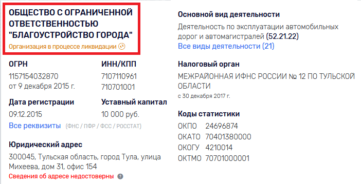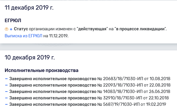 По старой привычке заглянув на сайт www.rusprofile.ru обнаружил новости о героях моих ноябрьских публикаций. ООО «Благоустройство города» с 12.12.2019 г. находится в состоянии ЛИКВИДАЦИИ.