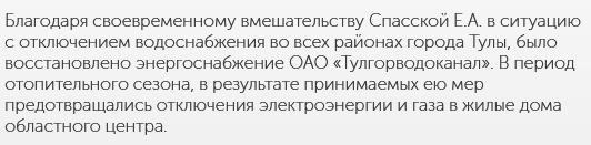 Огромный вклад в дело реформирования ЖКХ и обеспечения бесперебойной работы АО «Тулагорводоканал» внесла и почетный гражданин города Тулы, а ныне заместитель директора АО «Тулагорводоканал» по правовым вопросам Евгения Спасская.