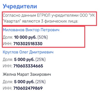 Милованов В.П. является учредителем ООО УК «Квартал», зарегистрированной 12.01.2016 г.. Ранее учредителем и директором этой УК был сам Милованов Р.В., но 23.06.2016 г. передал компанию отцу. Странно, конечно, что такие откровенные бизнес таланты отца Милованова Р.В. проявились лишь после того, как его сын, начал трудиться в сфере муниципального ЖКХ и стал подельником Сычева А.С.. Но сейчас не об этом. А вот, что мы снова наблюдаем: ООО УК «Квартал» зарегистрировано по тому же адресу, где зарегистрированы компании самого Сычева и его ближайших сподвижников и родственников, в частности, дочери и жены.