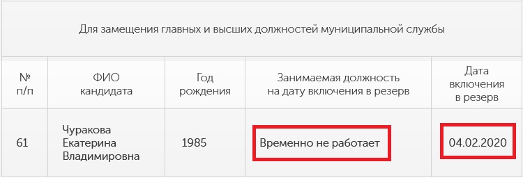 … в кадровый резерв она попала только … 04.02.2020 г. и на тот момент временно не работала.
