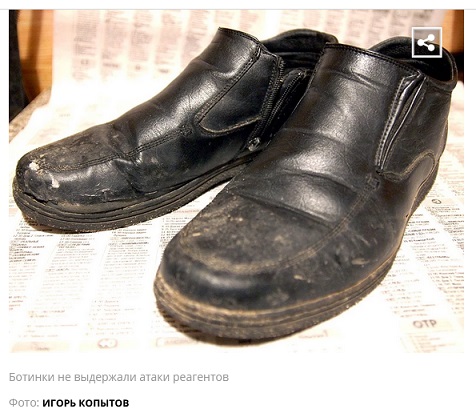 Другой пишет: «Накануне с последствиями тотальной обработки наших дорог всякой дрянью столкнулся и я — прямо на улице «раскисли» ботинки. Ну ладно, у меня они были так себе – среднего ценового диапазона. Материал – так называемая экокожа (по-нашему, читай – просто усовершенствованный кожзам). Без особых претензий, как говорится, – живут один — полтора сезона по естественным причинам, вызванным качеством. Но приятель прикупил реально дорогие настоящие кожаные ботиночки. И что? Через неделю на них стала появляться устойчивая полоска белого налета – и никакие средства по уходу за обувью не помогали. Лишь временно маскировали внешне проблему до первого же выхода на улицу». С ними солидарен третий: «Выставить бы им счета за испорченную обувь, машины, за лечение аллергии, за разрушенный асфальт, а, главное, за подорванное здоровье!»
