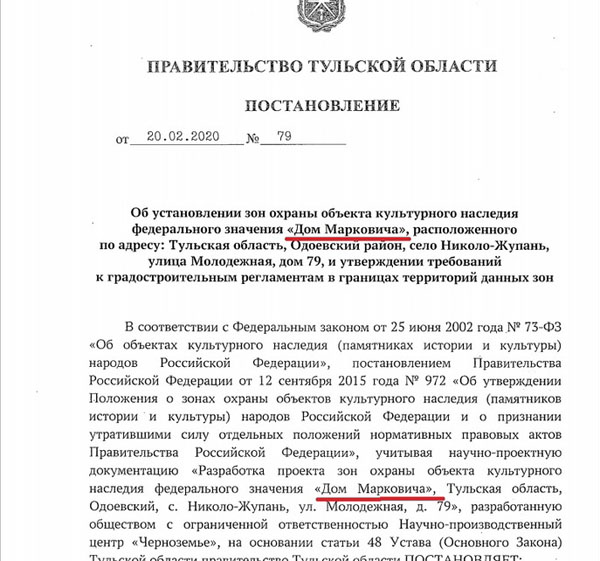 Документ, подписанный 20 февраля и опубликованный на сайте нормативно-правовых актов Тульского правительства, как подтвердила Троицкая-Миркович, также содержит ошибку в названии усадьбы.