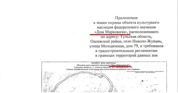 Адрес памятника, вокруг которого устанавливается охранная зона – Одоевский район, село Николо-Жупань, улица Молодежная, дом 79. Однако, по этому адресу находится усадьба героя войны 1812 года, генерала Александра Мирковича.