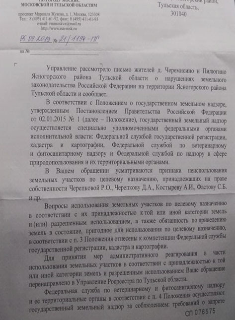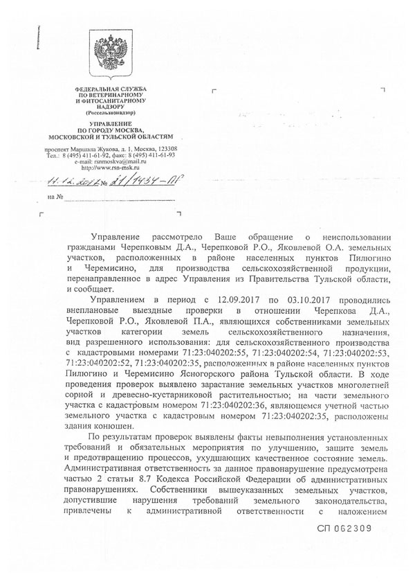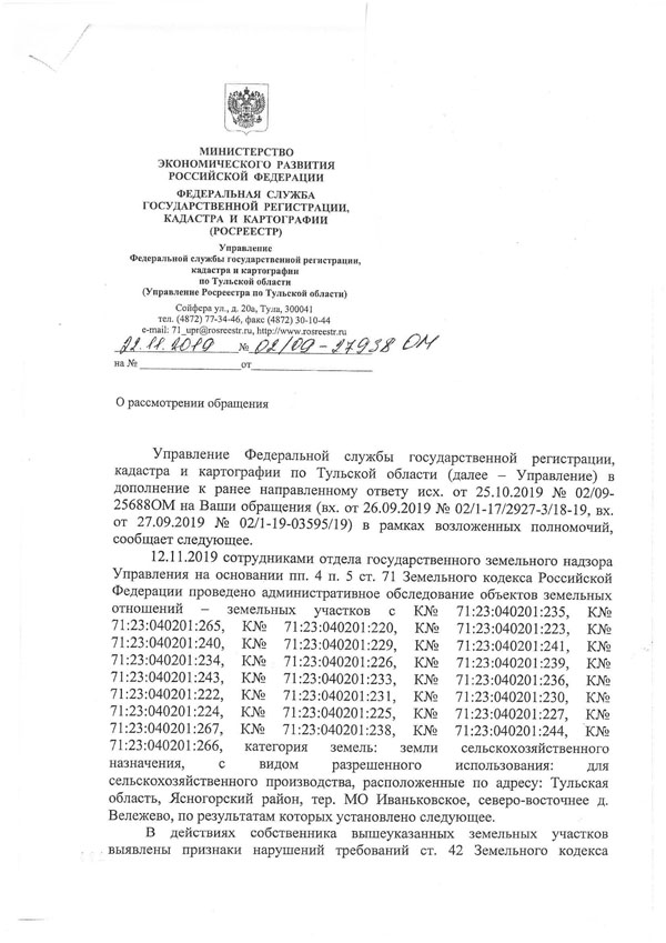 О перечисленных выше правонарушениях свидетельствуют документы Управления Росреестра и Россельхознадзора в по Тульской области.