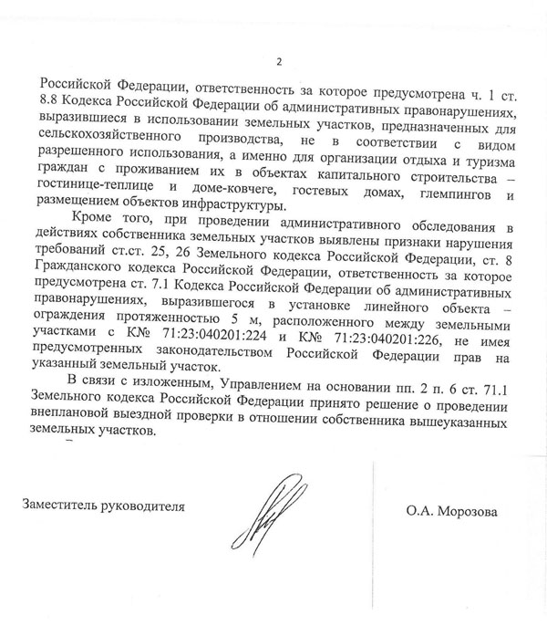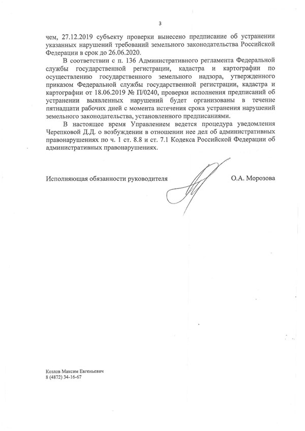 Зам. Руководителя Росреестра по Тульской области О.А. Морозовой 3-4 год замечательно курсирует земельных правонарушителей, каждые пол-года продлевая им предписания, а для возбуждения дела об административном правонарушении Д.Д. Черепковой у чиновников не нашлось возможности своевременно уведомить правонарушитель нибудь о составлении протокола.