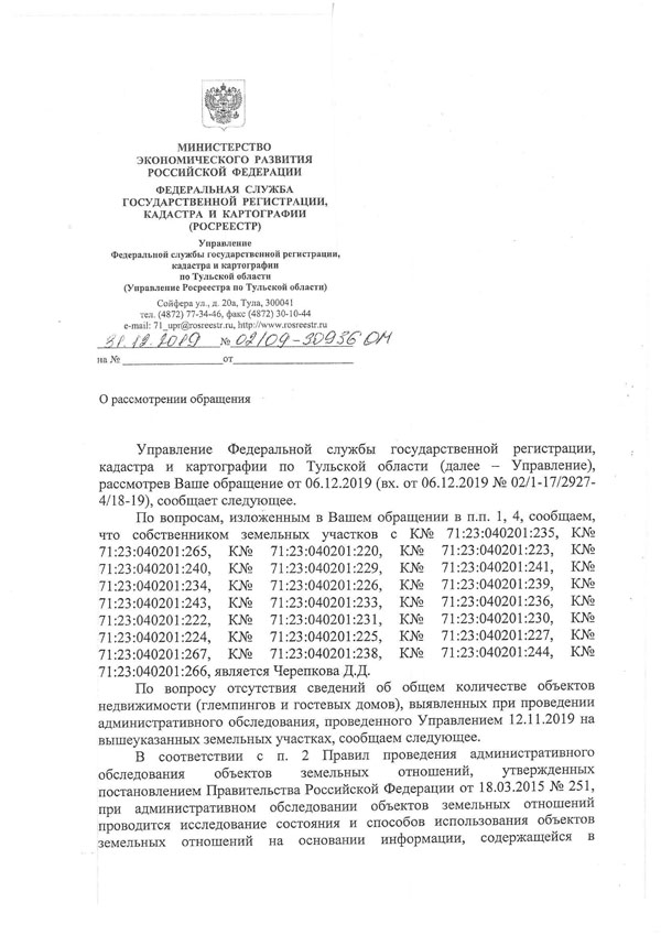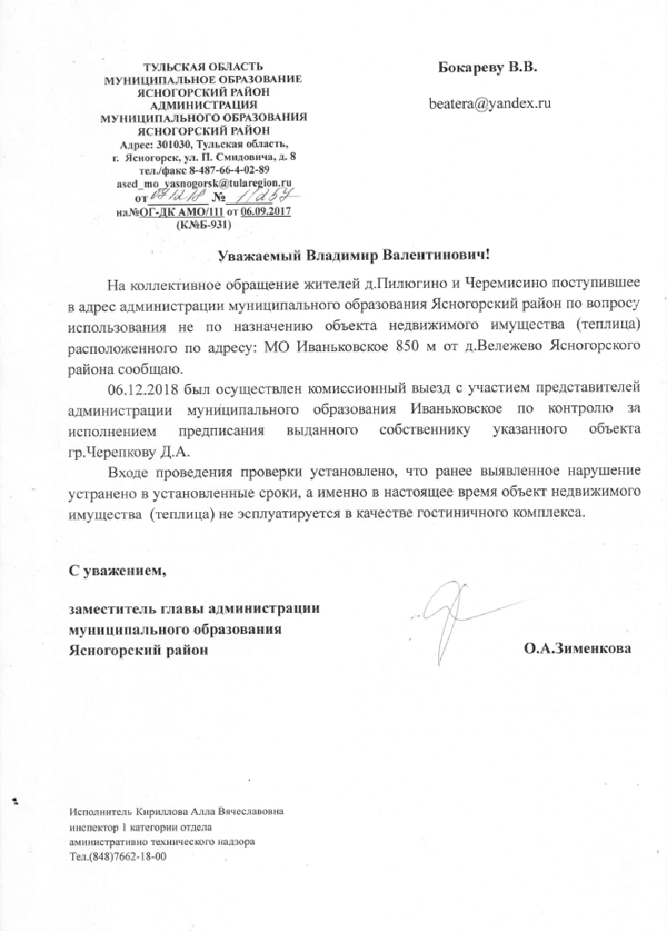 Ответ зам. главы администрации АМО Ясногорский район О.А. Зименковой (декабрь 2018 г.) о якобы устранении Д.А. Черепковым  правонарушения – гостиницы-теплицы является, по нашему предположению, подложным документом, поскольку, согласно выводам Управления Росреестра по Тульской области,  данная гостиница-теплица  продолжает функционировать как гостиничный комплекс, поменялся собственник земельного участка  вместо Д.А. Черепкова  им стала Д.Д., Черепкова,  но правонарушение  по-прежнему не устранено.