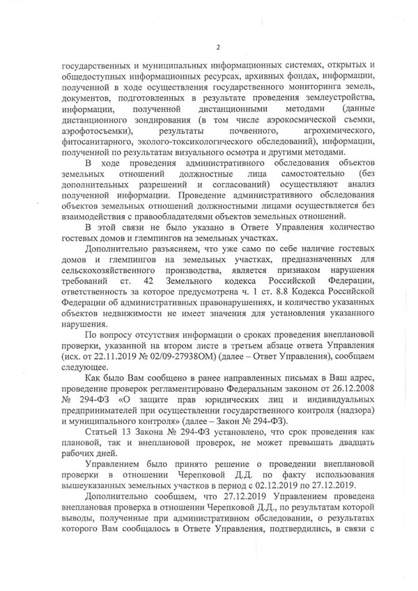 Пятый год на сельхозугодьях площадью более 500 га на территории  МО Иваньковское семейство Черепковых (Черепков Д.А., Черепкова Р.О., Черепкова Д.Д.) осуществляет <…> гостиничный бизнес (гостиницы, гостевые дома, глемпинги), используя сельхозугодья, предназначенные для товарного сельхозпроизводства, не по целевому назначению, <…>.