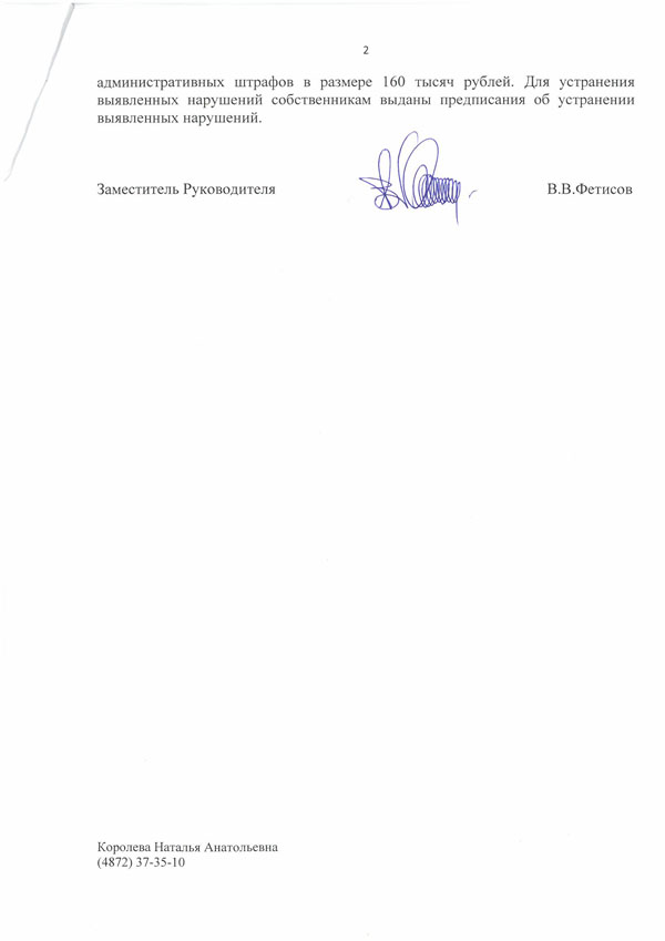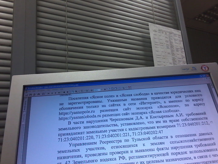 Неопровержимые доказательства  не устранения данного правонарушения  неоднократно представлялись в прокуратуру Ясногорского районного, прокуратуру Тульской области. Однако мер по пресечению правонарушения до сих пор не принято,  выезжавшие на место сотрудники  прокуратуры Ясногорского района и ОВД Ясногорского района Тульской области,  в упор не видят экономические правонарушения на сельхозугдьях и сельхозземлях  для товарного производства –  сдаваемые незаконно в аренду гостиницы, гостевые дома, глемпинги (незаконное предпринимательство).
