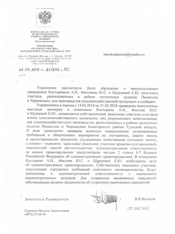 Таким образом, сравнительный анализ  официального Ответа  прокурора Тульской области Р.С. Праскова  от 11.10.2019 г.  и приведенного выше документа от 22сентября 2019 г. за подписью В.В. Мухина,  доказывает <…> лоббирование В.В. Мухиным и М.И. Козловой  <…> деятельности оккультной группы А.И. Костырева, имеющего статус злостных земельных правонарушителя, который повторно привлечен к административной ответственности (в первый раз  по ст. 8.7 КОАП РФ, а в сентябре 2019 г.  – возбуждено дело об административном правонарушении по 19.5 часть 25 КоАП РФ) за неисполнение  ранее выданных Россельхознадзором предписаний об устранении  земельных правонарушений См. Ответ от 5 сентября 2019  г. за подписью зам. руководителя Россельхознадзора  по Тульской области Е.В. Кошелевой.