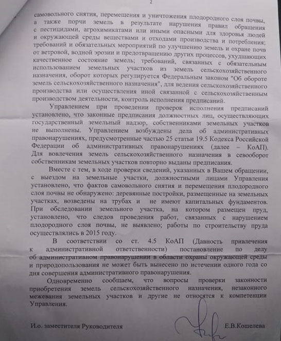 Сейчас появился новый, уже третий по счету, за подписью Ю.Н. Козлова, такой же противозаконный, как и предыдущие. Вознамерились поменять зону сельхозугодий, слов нет, одни выражения.