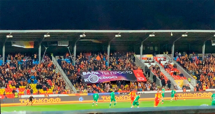 Sports.ru стало интересно, что это за волонтеры, и мы всего за 5 минут их нашли. Потому что они и не скрывались: еще во время матча опубликовали сообщение, что баннер вывесили участники команды «Молодежка ОНФ», а цель акции – «высказать слова поддержки в адрес легендарной женщины Валентины Терешковой».