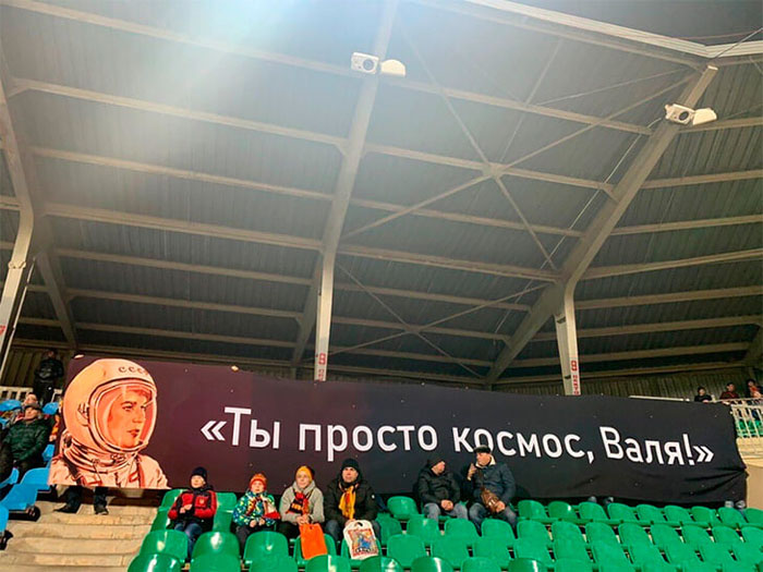 На нем видно, что баннеров про Терешкову на матче было даже два.
