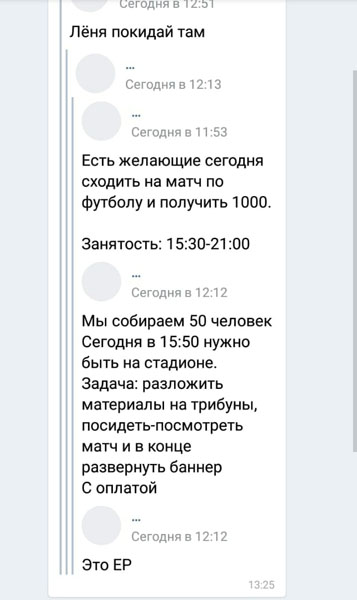 …Кастюкевич развернул тот самый баннер в Туле. (Позже телеграм-каналы Baza и «Фалькао не приехал» написали, что участников акции набирали в том числе по объявлению, обещая гонорар – 1000 рублей).