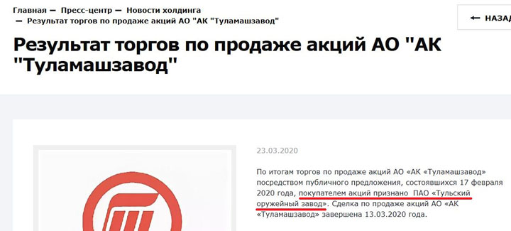 23 марта на официальном сайте холдинга «Высокоточные комплексы» была размещена информация о результатах торгов по продаже акций АО «АК «Туламашзавод». Покупателем акций признано ПАО «Тульский оружейный завод».