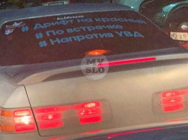 Ранее мы [myslo.ru] сообщали, что пользователь Myslo заметил этот автомобиль на одной из улиц города. Судя по присланному в редакцию фото, 22-летний хозяин авто не особенно расстроился из-за произошедшего и решил похайповать на вменяемых ему нарушениях ПДД. Он наклеил на заднее стекло своего авто хештеги: #дрифт на красный #По встречке и #Напротив УВД.