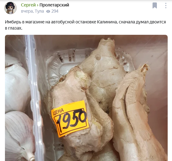 Если еще пару недель назад килограмм имбиря стоил в районе 300 рублей, то сейчас судя по фото туляков пользователей «Яндекс.район» розничные цены приблизились к 2.000 рублей.