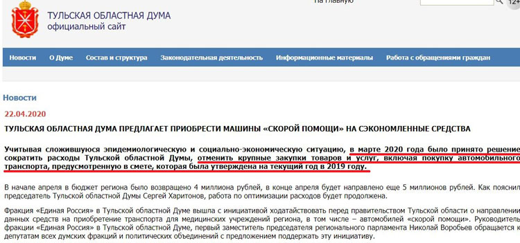 Ну надо же, оказывается непотопляемый Сергей Харитонов со товарищи еще в марте 2020 года приняли решение «сократить расходы Тульской областной Думы, отменить крупные закупки товаров и услуг, включая покупку автомобильного транспорта». Правда, немного странно, что главный областной единоросс Николай Воробьев со своей инициативой купить на сэкономленные деньги автомобили «скорой помощи» вышел только в конце апреля, а не в марте, когда якобы принимали решение об экономии.