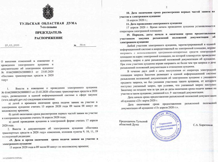 А 30 марта на официальном сайте госзакупок было размещено распоряжение Харитонова от 27 марта 2020 года «О внесении изменений в извещение о проведении электронного аукциона и документацию об электронном аукционе № 0166200002620000013 от 23.03.2020 «Поставка транспортных средств в 2020 году»: