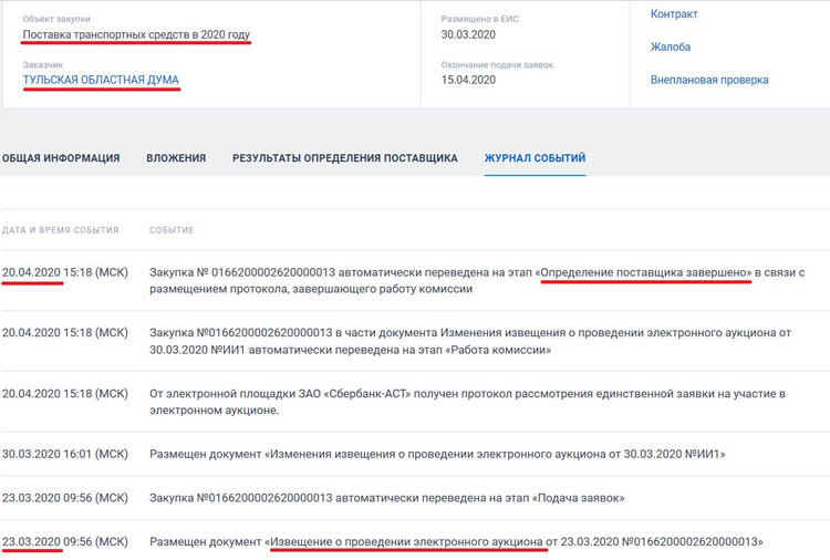 Как видно по содержанию распоряжения, никто не отменял закупку, лишь были уточнены формулировки по срокам. Отсутствие каких-либо действий областной власти по отмене аукциона в марте и апреле подтверждается и журналом событий на официальном сайте госзакупок: