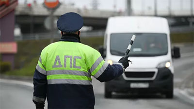 Инспектор дорожно-патрульной службы останавливает водителя для проверки у него цифрового пропуска