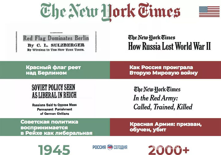 Поэтому если в 1945 году негативные упоминания СССР в ведущих западных СМИ имелись в следовых количествах, и то мельком, — то сейчас они повелевают дискурсом и формируют картину прошлого.