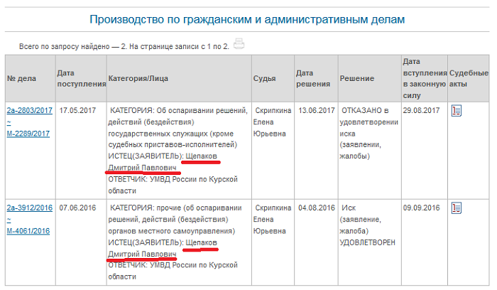 На сайте Ленинского районного суда г.Курск имеется следующая информация об участии некого Д.П.Щепакова в судебных разбирательствах с УМВД России по Курской области.