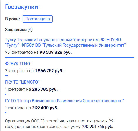 Сегодня мы предлагаем вашему вниманию сведенные воедино государственные контракты на клининг, заключенные с Тульским государственным университетом четырьмя аффилированными между собой предприятиями.