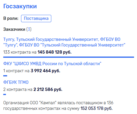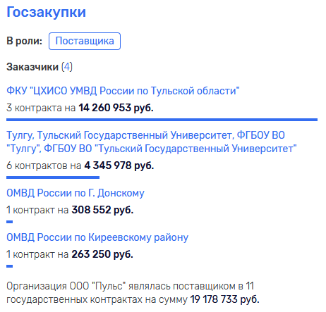 Другим крупнейшим заказчиком услуг этих организаций является … ФЕДЕРАЛЬНОЕ КАЗЕННОЕ УЧРЕЖДЕНИЕ «ЦЕНТР ХОЗЯЙСТВЕННОГО И СЕРВИСНОГО ОБЕСПЕЧЕНИЯ УПРАВЛЕНИЯ МИНИСТЕРСТВА ВНУТРЕННИХ ДЕЛ РОССИЙСКОЙ ФЕДЕРАЦИИ ПО ТУЛЬСКОЙ ОБЛАСТИ».