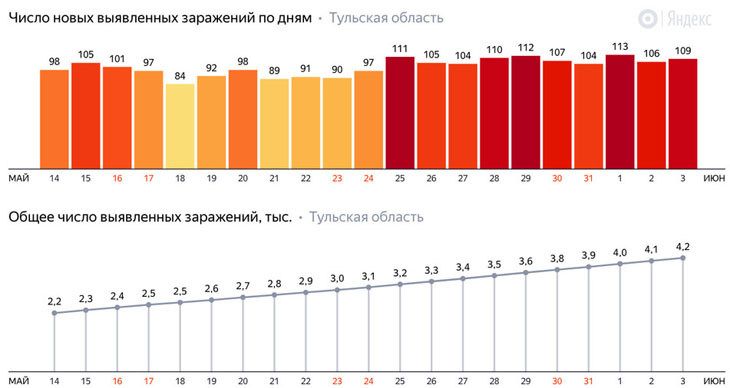 Тульская область плавно переживает пиковые значения коронавирусных заражений. Пока что наибольший показатель инфицированных за сутки зафиксирован 1 июня. Второй показатель по численности заболевших был зафиксирован 29 мая. И третий — 25 мая.