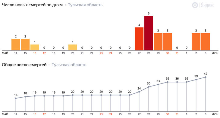 Статистика смертности от коронавируса в Тульской области выросла до 42 человек. Максимальное число умерших было зафиксировано 28 мая — 6 человек. А [вчера], 3 июня, умерло трое.